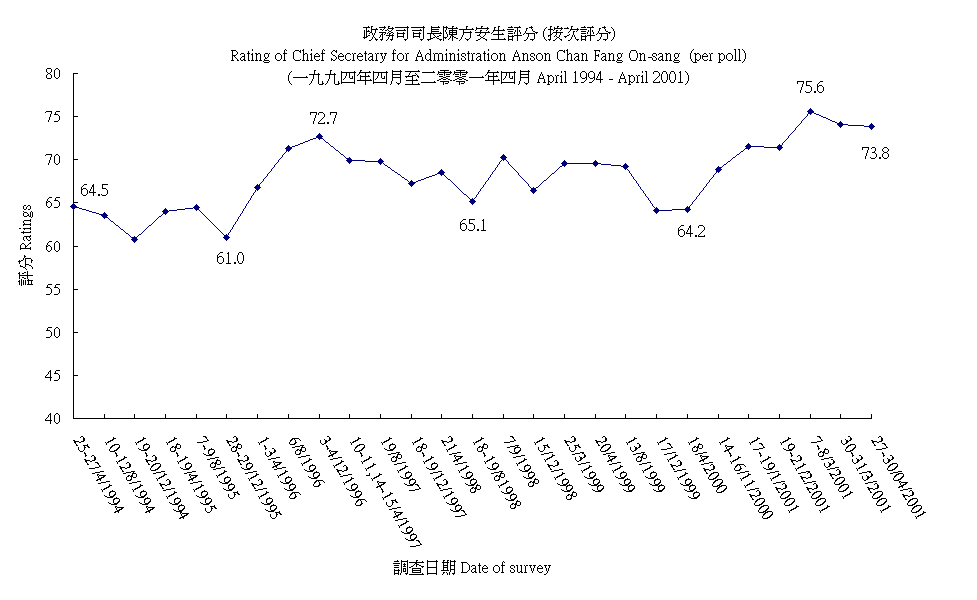 政務司司長陳方安生評分 (按次計算) Rating of Chief Secretary for Administration Anson Chan Fang On-sang (per poll) |